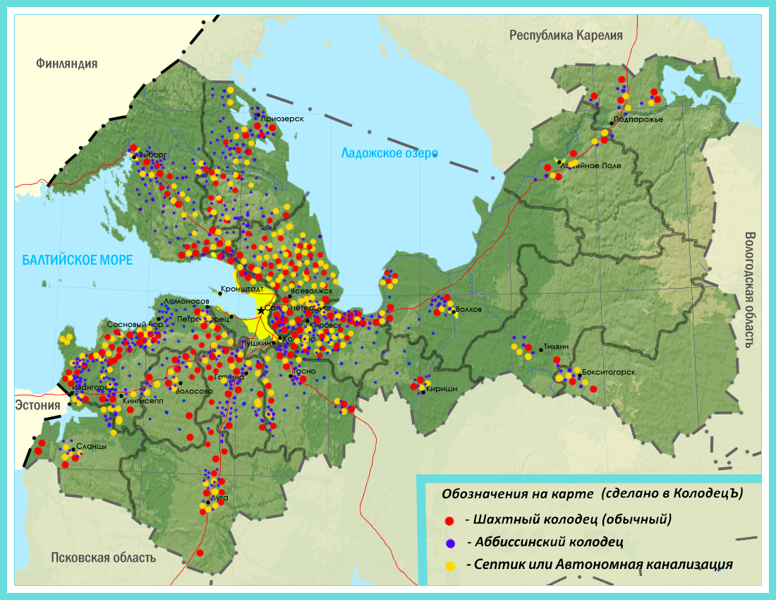 Красным кругом отмечены колодцы (чистка и монтаж под ключ)